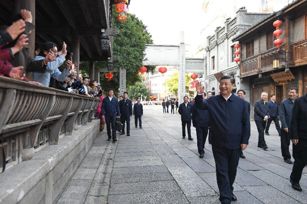△2021年3月24日下午,中共中央总书记、国家主席、中央军委主席习近平在福州三坊七巷历史文化街区考察时,向游客和市民招手致意。