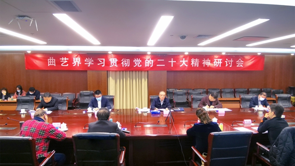 与会人员一致表示,要在党的二十大精神指引下,深刻领会自身肩负的重大而光荣的使命责任,潜心耕耘、埋头苦干,把个人艺术生命同国家前途、民族命运、人民愿望紧密结合起来,把个人艺术创造写到民族复兴的历史上、写在人民奋斗的征程中,矢志不渝用实际行动增强民族复兴的精神力量、推进文化自信自强、建设强大意识形态、培育时代新人、推出更多优秀作品、提升中华文明传播力影响力、铸就文化新辉煌,不断推出更多更好增强人民精神力量的优秀作品,奋力谱写出富有中国特色、中国风格、中国气派的时代华章,为全面建设社会主义文化强国、全面建设社会主义现代化国家、全面实现中华民族伟大复兴贡献曲艺力量。