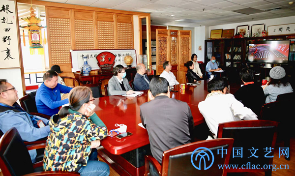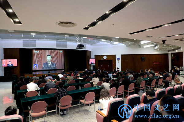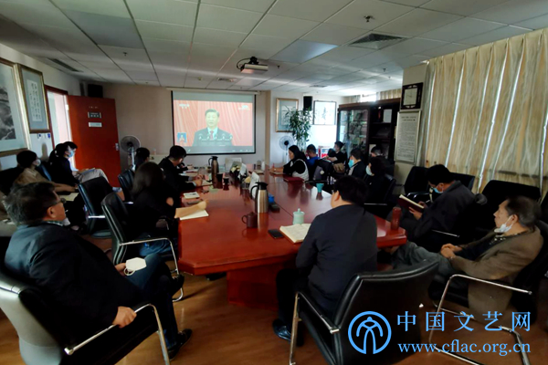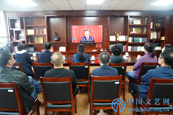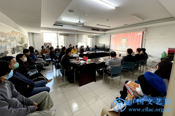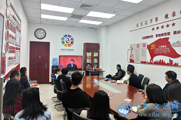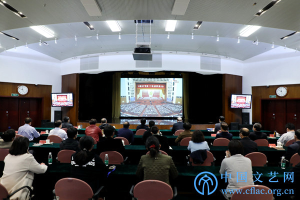 10月16日上午,中国共产党第二十次全国代表大会在北京隆重开幕,习近平总书记代表第十九届中央委员会向大会作报告。图为中国民间文艺家协会组织全体党员和干部职工收听收看党的二十大开幕会直播盛况。