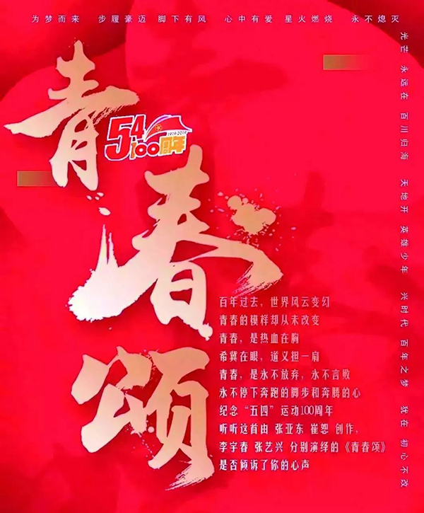 为纪念五四运动100周年,共青团中央联合中国青年出版总社精心打造了音乐作品《青春颂》。由知名音乐人崔恕作词、张亚东作曲并后期制作。歌曲旋律柔美、词句铿锵,唱出了青春的绚丽和激情、理想与豪迈;MV以唯美的画面,讲述了新旧两代青年彼此激励、自我救赎、奔向光明的故事,用内心纯粹的情感,编织壮阔的中国梦,在令人血脉偾张的同时,给人以力量和希望。