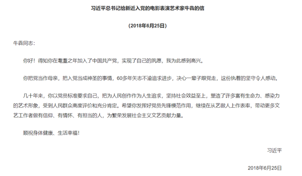 2018年6月25日,习近平总书记给新入党的时年83岁高龄的电影表演艺术家牛犇写信。