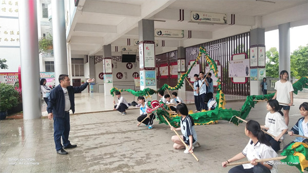 广西民间文艺志愿者周建孟走进南宁青秀区长塘镇初级中学向学生传授壮族芭蕉香火龙舞技艺。