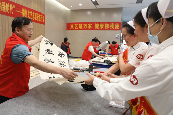 柳州市文联组织文艺志愿者到柳州市柳铁中心医院开展“喜迎二十大 建功新时代”文艺志愿服务系列活动,现场向医务人员赠送书法、美术作品等。