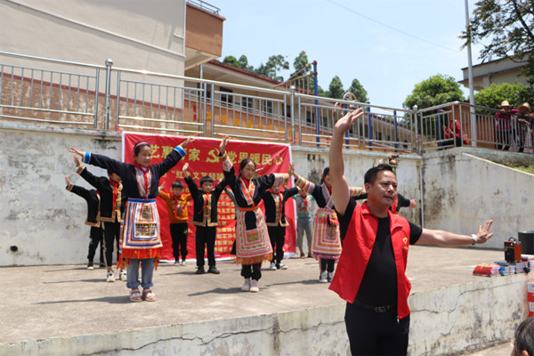 贺州市文联组成“红色文艺轻骑兵”小分队,先后到平桂区鹅塘镇大明小学、八步区步头镇保塘小学等地开展文艺志愿服务活动。图为文艺志愿者谢国存教小学生舞蹈。