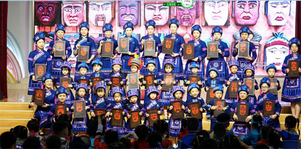 河池市文联开展文艺志愿服务走进河池市金城江区第二小学、河池市直机关幼儿园、河池市职业教育中心学校,向师生们传授仫佬族剪纸、音乐铜鼓、彩调等民族文化技艺。图为河池市文艺志愿者与河池市直机关幼儿园的孩子们一起展示仫佬族剪纸作品。