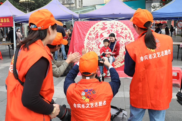来宾市文联围绕“文艺惠民、文艺为民”主题,集中开展文艺专题培训、义务拍摄、集中学习等方面的文艺志愿服务活动。图为来宾市摄影家协会为群众义务拍摄全家福。