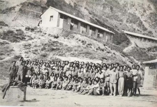 1938年3月14日, 鲁艺首期学员60余人在延安北门外云梯山麓开学上课。图为全校师生在北门外合影。