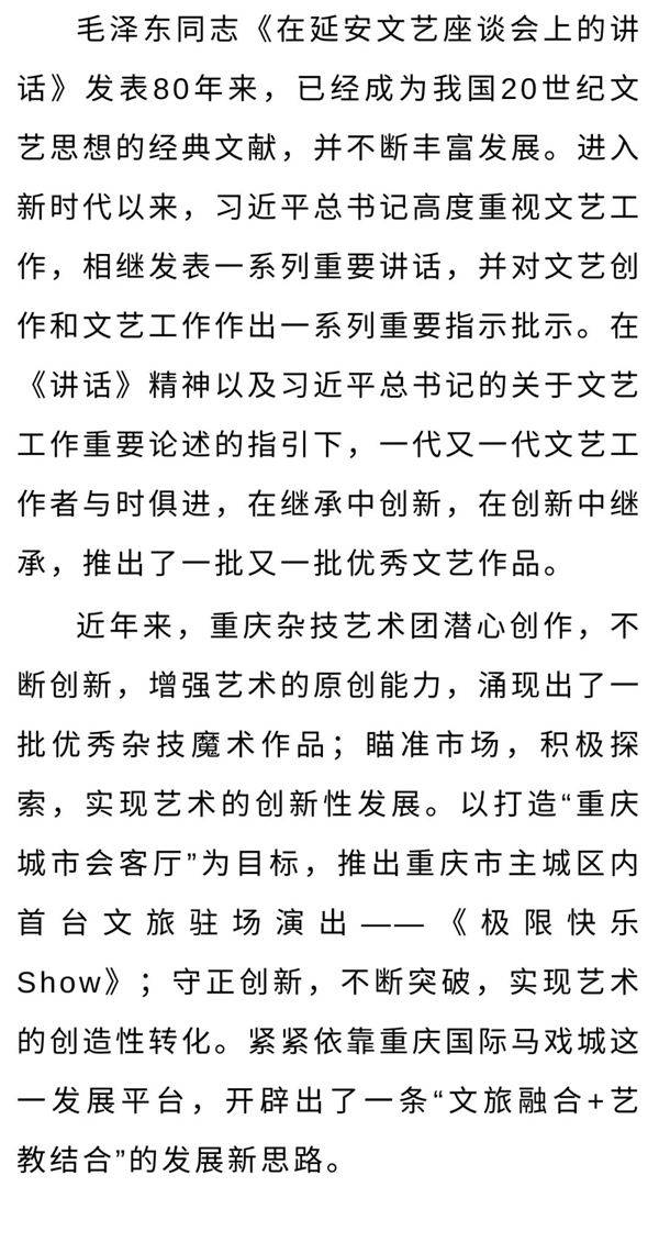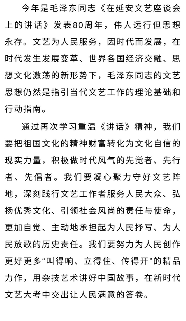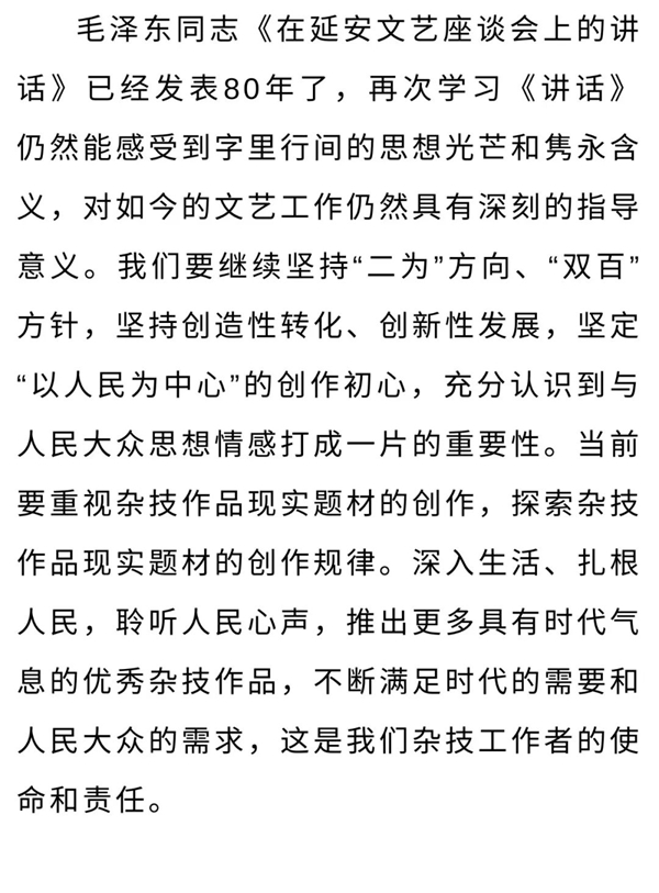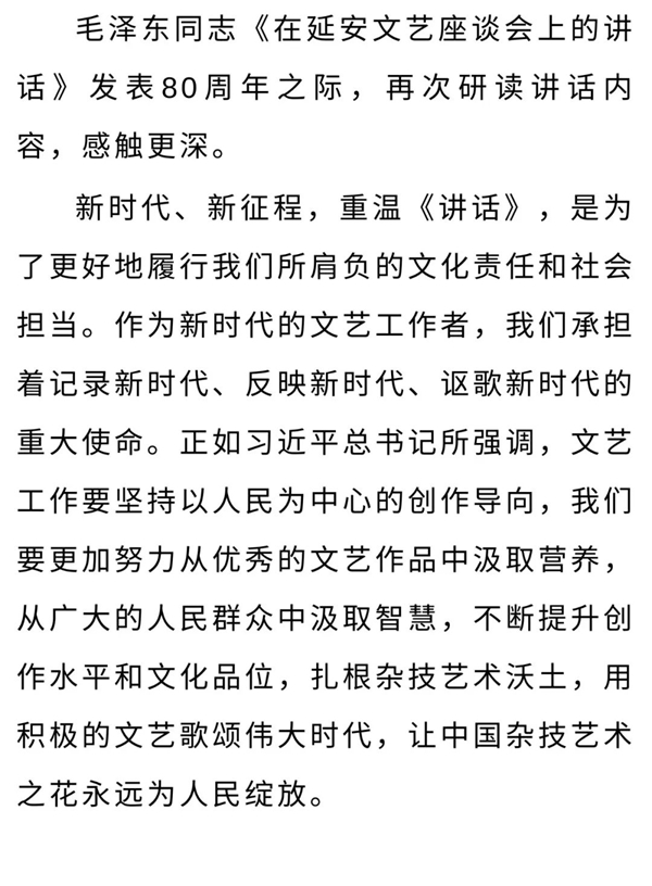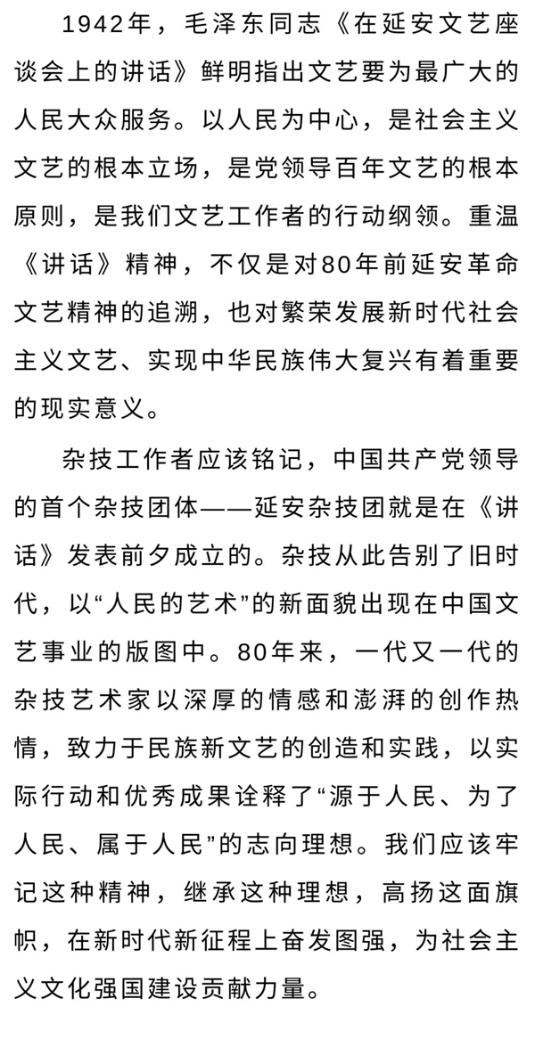 原标题:与人民同心 与时代同行——杂技界纪念毛泽东同志《在延安文艺座谈会上的讲话》发表80周年