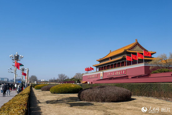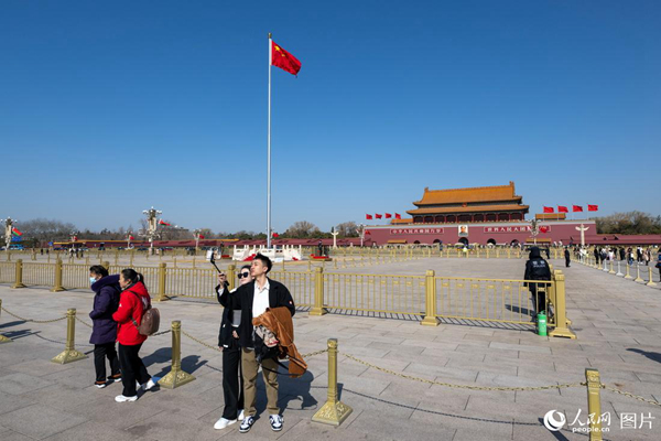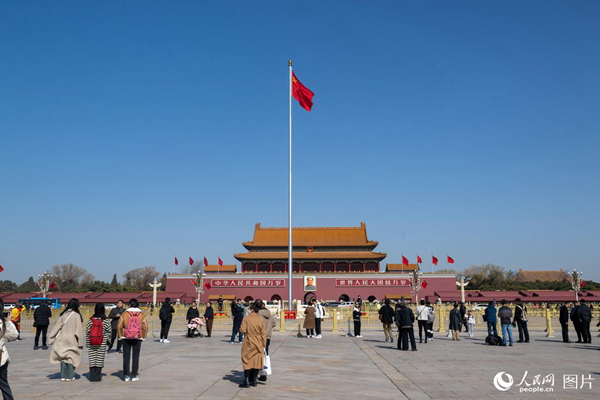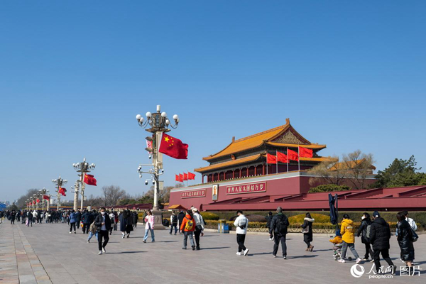2023年3月2日,全国两会召开在即,北京天安门广场上红旗迎风招展,游客络绎不绝。人民网记者 翁奇羽摄