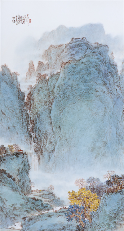 作品传承民国新粉彩技艺,以中国画高远法构图,描绘出高耸的山峰、飞流而下的瀑布,尽显古代文人出游的雅趣。