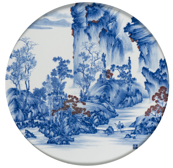 《秋山幽居图》 青花釉里红瓷板画 郑正恩