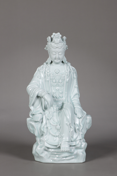 作品采用首创于宋代景德镇的青白瓷釉技艺,是传承中国传统瓷塑艺术的佳作,其釉色柔和装饰华丽,表现出观音菩萨优雅高贵的气质。