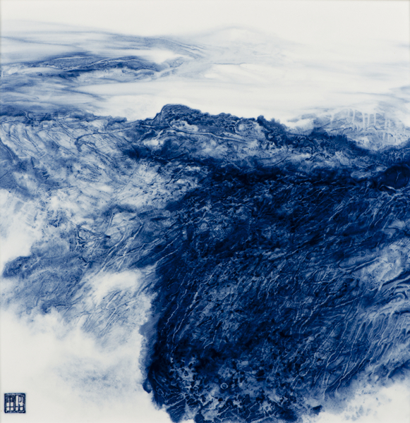 作品以釉下青花作为绘画媒介,采用“泼墨”手法写意山水,很好地体现了作者对中国传统绘画装饰技法的当代创作表达。