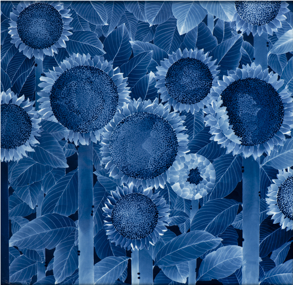 此为现代青花装饰瓷板画作品,表达了对向日葵向阳而生的蓬勃生机的赞美,以借物喻人的方式赞美新时代的欣欣向荣。