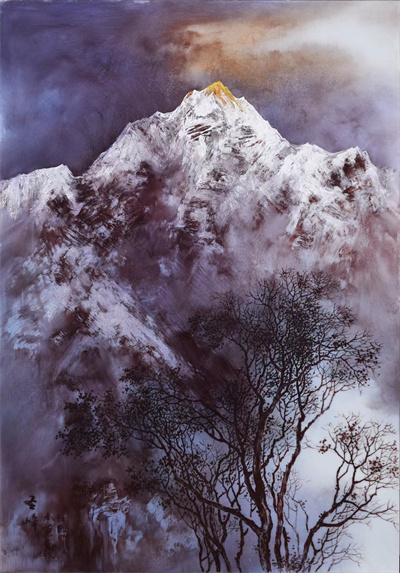 该作品将现代油画技法与传统新彩装饰工艺结合,整体冷色调,以大视觉角度表现雪域高原圣峰之壮阔雄美。