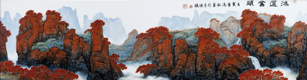 作品运用中国传统国画技法绘制了一幅深秋时节的山川美景,蕴含鸿运当头、吉祥好运、顺利如意等美好寓意。