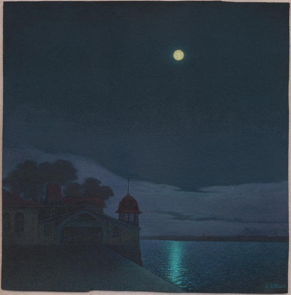 作品选用灰紫色和粉绿色来描绘月光,以写实技法来表达皎洁月光照耀在松花江上的美丽夜景,展示了大自然的诗意之美。