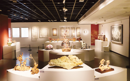 在“民间瑰宝”板块,展出的61件(组)民间工艺作品巧妙地融合浙江地域特色、传统技艺,反映人民群众的生活习俗、审美观念和精神追求。其中,吴尧辉的《大唐盛世》(系列组雕)之《马球》作为中国民间文艺山花奖的获奖作品,结合镂雕、透雕、拼雕等传统技法,展现了一支骑术精湛、英姿飒爽的女子马球队,反映出国泰民安、国富民强的美好生活;雷建栲荣获浙江民间文艺映山红奖的作品《游春图》,则使用国家级非遗温州瓯塑传统堆漆工艺创作,以祖国的大好河山、科技日新月异、人们踏春游玩等为主题,展现了新时代祖国的繁荣昌盛。