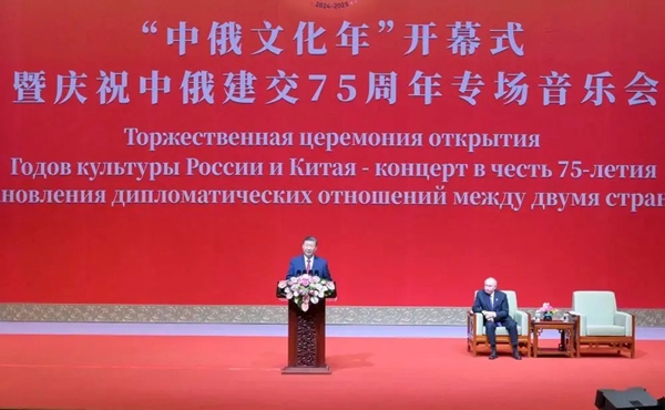 2024年5月16日下午,习近平主席在“中俄文化年”开幕式暨庆祝中俄建交75周年专场音乐会上致辞时提到,“今晚,中国中央民族乐团和俄罗斯奥西波夫乐团的艺术家联袂呈现的曲目中既有《莫斯科郊外的晚上》、《喀秋莎》等在中国家喻户晓的俄罗斯名曲,也有《渔舟唱晚》、《花好月圆》等独具东方韵味的中国名乐。我们相信,这场音乐盛宴必将成为中俄文化交流互鉴的精彩华章。” 5月16日下午,国家主席习近平和俄罗斯总统普京在北京国家大剧院共同出席“中俄文化年”开幕式暨庆祝中俄建交75周年专场音乐会并致辞。新华社记者 高洁 摄