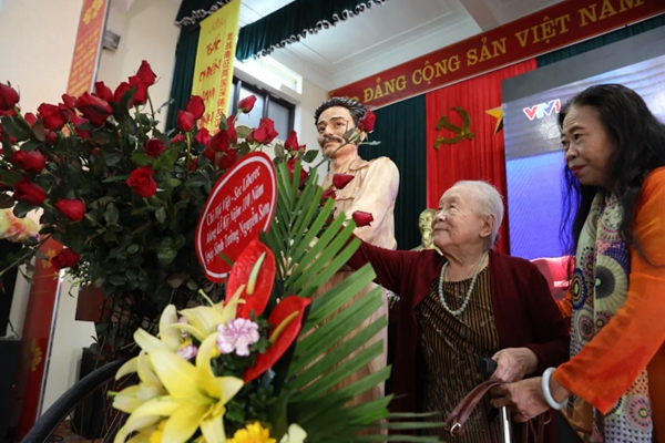 2018年9月30日,在越南河内市嘉林县骄骑乡,洪水将军亲属向其雕像献花。新华社记者 王迪 摄
