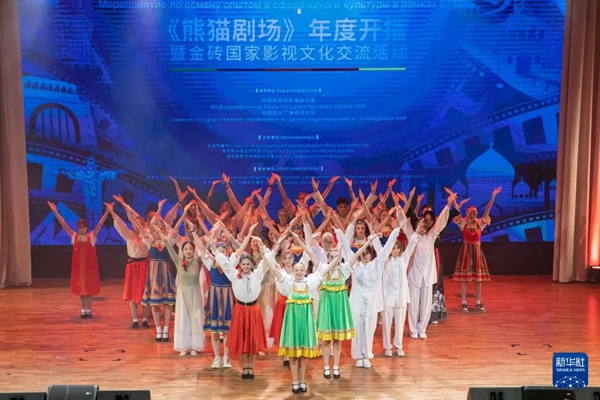 9月22日,中俄青少年在莫斯科《熊猫剧场》年度开播暨金砖国家影视文化交流活动上表演节目。新华社记者 白雪骐 摄