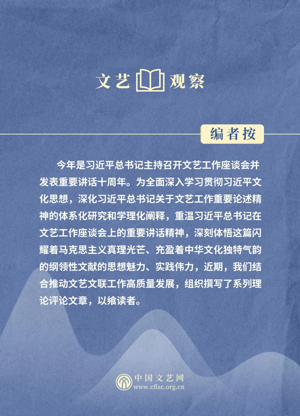 今年是习近平总书记主持召开文艺工作座谈会并发表重要讲话十周年。为全面深入学习贯彻习近平文化思想,深化习近平总书记关于文艺工作重要论述精神的体系化研究和学理化阐释,重温习近平总书记在文艺工作座谈会上的重要讲话精神,深刻体悟这篇闪耀着马克思主义真理光芒、充盈着中华文化独特气韵的纲领性文献的思想魅力、实践伟力,近期,我们结合推动文艺文联工作高质量发展,组织撰写了系列理论评论文章,以飨读者。