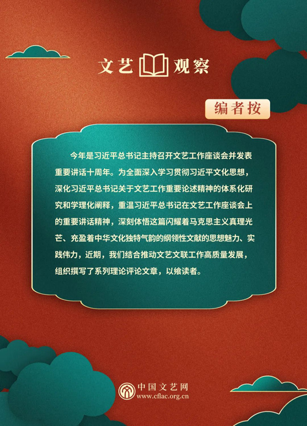 今年是习近平总书记主持召开文艺工作座谈会并发表重要讲话十周年。为全面深入学习贯彻习近平文化思想,深化习近平总书记关于文艺工作重要论述精神的体系化研究和学理化阐释,重温习近平总书记在文艺工作座谈会上的重要讲话精神,深刻体悟这篇闪耀着马克思主义真理光芒、充盈着中华文化独特气韵的纲领性文献的思想魅力、实践伟力,近期,我们结合推动文艺文联工作高质量发展,组织撰写了系列理论评论文章,以飨读者。