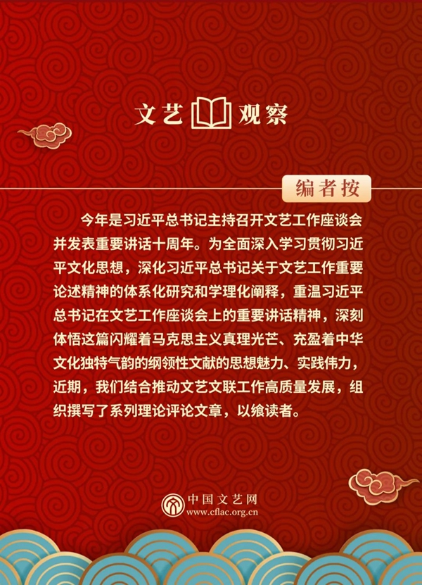 今年是习近平总书记主持召开文艺工作座谈会并发表重要讲话十周年。为全面深入学习贯彻习近平文化思想,深化习近平总书记关于文艺工作重要论述精神的体系化研究和学理化阐释,重温习近平总书记在文艺工作座谈会上的重要讲话精神,深刻体悟这篇闪耀着马克思主义真理光芒、充盈着中华文化独特气韵的纲领性文献的思想魅力、实践伟力,近期,我们结合推动文艺文联工作高质量发展,组织撰写了系列理论评论文章,以飨读者。
