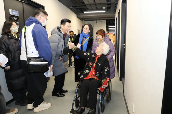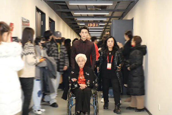 青年演员吴磊搀扶行动不便的老艺术家落座。