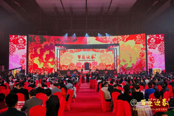 ——共创共享,充分发挥中国文联“两个优势”。“百花迎春——中国文学艺术界2024春节大联欢”由中国文学艺术界联合会主办,中国文联文艺志愿服务中心承办,各全国文艺家协会协办。老中青文艺工作者同台献礼,各艺术门类花式登场,高校志愿者、媒体记者深度参与,各方合力共襄盛举。大联欢由周涛、任鲁豫、朱迅、蔡国庆、张韬、蓝羽共同主持,田华、蒋大为、王晓棠、于淑珍、张勇手、王馥荔、阎维文、刘秉义、陈铎等老一辈艺术家集体亮相,殷秀梅、张凯丽、吴碧霞、林永健、何赛飞、雷佳音等艺术家各展风采,王俊凯、李宇春、王鹤棣、罗一舟等青年文艺工作者火爆现场。中国歌剧舞剧院、北京京剧院、四川省川剧院、重庆市文联、浙江曲艺杂技总团等来自全国各地的文艺组织,以及中央音乐学院合唱团、中央音乐学院民乐团、中央戏剧学院音乐剧系、沈阳音乐学院舞蹈学院等高校艺术团参与其中。各艺术门类的精品力作汇聚一堂,音乐领域的作品有歌曲《骁》等、舞蹈领域的作品有《乐舞中华》等、美术领域的有《百花图》等、曲艺领域的有祝颂词与歌曲《如愿》和相声《文联送对联》等、杂技领域的有器乐与杂技《忆江南》等、影视领域的有影视组曲《光影画卷》等,共同汇聚成一场精彩纷呈、喜气洋洋的文艺大联欢。众多高校学生志愿者自发报名参与其中,在实践中学习知识,在文艺中浸润心灵。20余家中央新闻媒体参与现场报道,百度、爱奇艺、微博、抖音、快手等视频平台也给予大力支持。以文化人,以艺通心,本次“百花迎春”大联欢以文艺沟通社会各界形成多方合力,助力文艺事业繁荣发展。