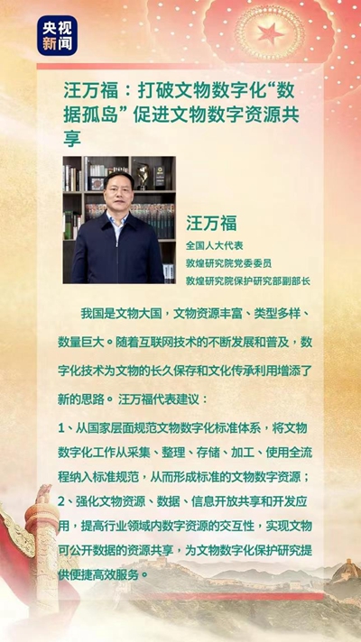 为了打破文物数字化“数据孤岛”,推进标准建设及资源共享,今年全国两会,汪万福带来了两个方面的建议: