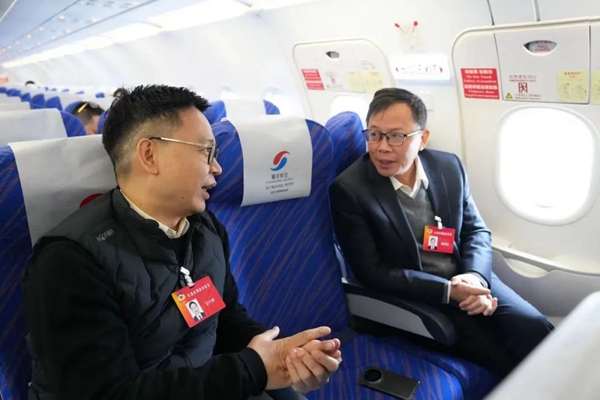 3月3日,住渝全国政协委员在赴京航班上交谈。 柯俊彬 摄