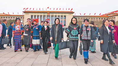 十四届全国人大二次会议3月4日举行预备会议。图为代表们在北京人民大会堂前。