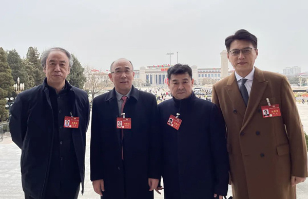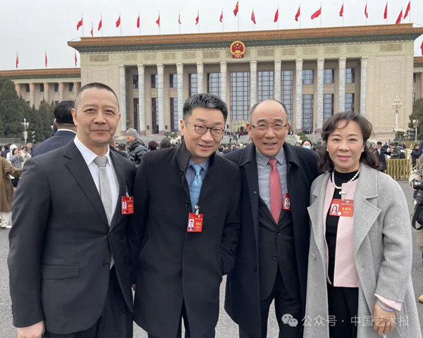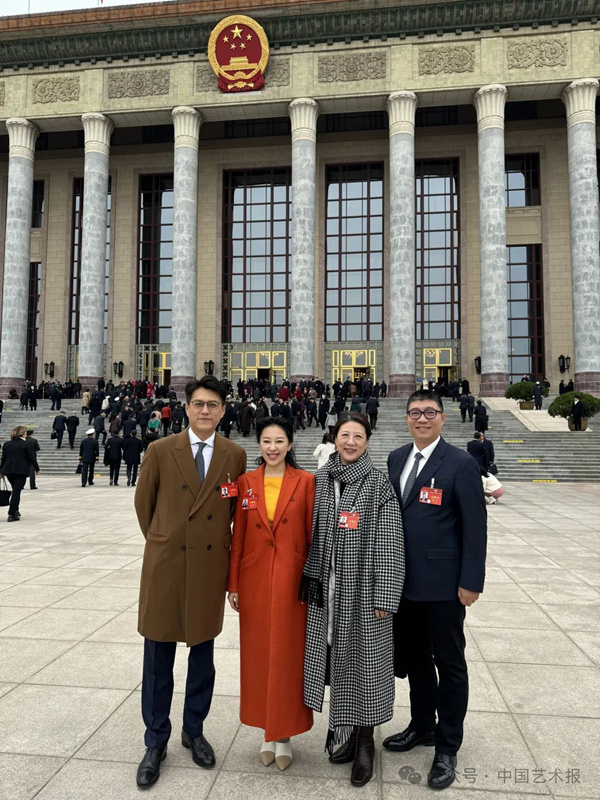 左起:全国政协委员、民盟北京市委副主委、中国煤矿文工团副团长靳东,全国政协委员、中央民族乐团团长赵聪,全国政协委员、中国儿童艺术剧院院长冯俐,全国政协委员、中央戏剧学院院长郝戎