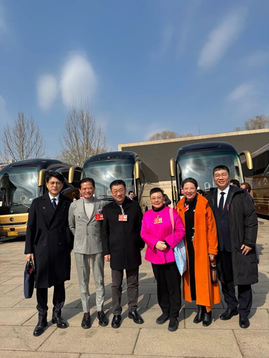 左起:全国政协委员、中国煤矿文工团团长靳东,全国政协委员、香港歌剧院创始人兼艺术总监莫华伦,全国政协委员、中国音协副主席、中国音乐学院院长李心草,全国政协委员、上海市文联党组成员、专职副主席谷好好,全国政协委员、中国儿童艺术剧院院长冯俐,全国政协委员、中央戏剧学院院长郝戎