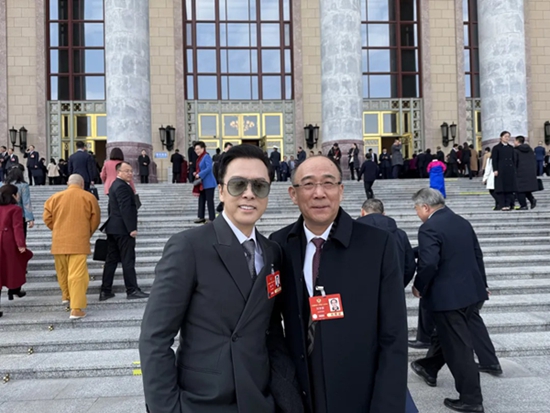 左起:全国政协委员、中国香港演员甄子丹,全国政协委员、中国广播艺术团团长刘学俊