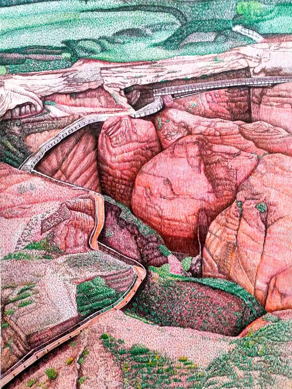 作品通过“微点成线,微线成面”的技法,精确刻画陕北地貌的沟壑、纵横、窑洞的沧桑质感。擅用圆珠笔作画,每一笔都精准控制,形成不可逆的层次感。