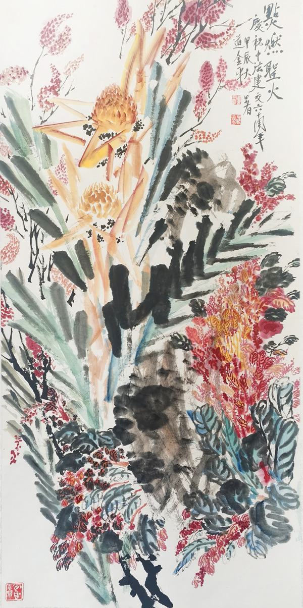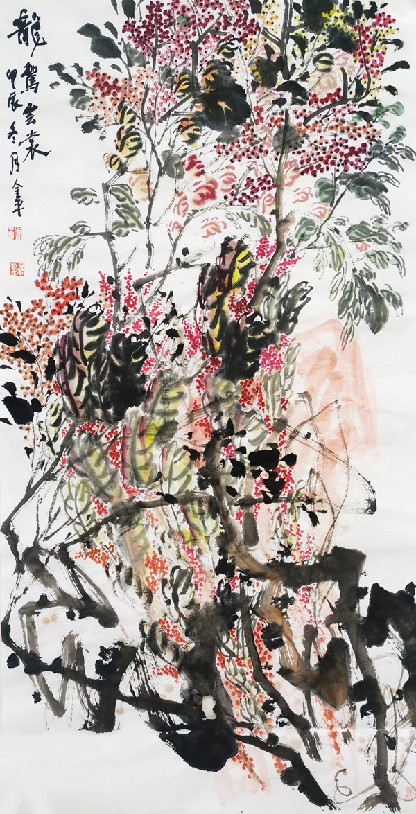 专攻花鸟,以书入画,融传统笔墨与现代构成于一体。其作汲取皮影、剪纸、青铜纹饰等民间艺术精华,以金石笔意写自然天趣。构图突破传统留白,以虚实相生的光影营造空间意境;线条刚柔并济,墨色层次丰富,凸显花鸟神韵。作品既承文人画传统,又以当代视角诠释热带雨林题材,在传统与现代的碰撞中开拓新境。其艺术实践立足文脉而锐意创新,形成了独特的个人风格,为当代中国画发展提供了新范式。