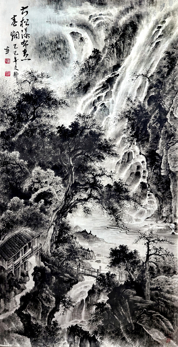 《古松瀑布煮春烟》136cmx68cm