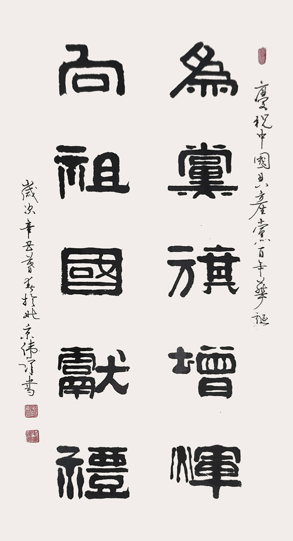 其书法作品沉着有力,雄浑多变,张弛有度,刚中见柔。主张“执笔于手,纵笔于心”,作品主副笔相映,虚实相生。