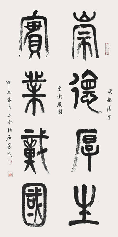 自幼酷爱书法,其书法创作风格以篆书见长,博涉多体,研习历代篆书名家书风。章法疏阔均衡,整体气势魄力雄强,自由书写中不失规矩。