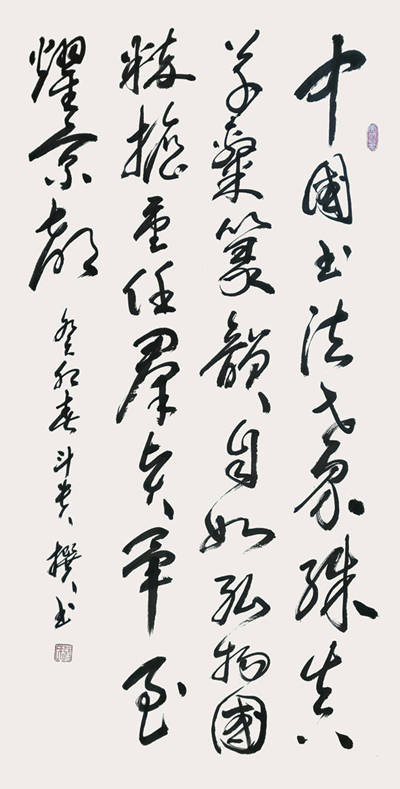 其书法创作以“碑帖融合”为核心理念,早年受云南地方碑刻影响,后系统研习欧阳询楷书与米芾行草。以隶书、草书见长,整体风格注重“中庸”之道,追求笔墨的收放自如。