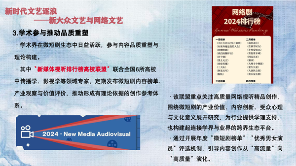 除产业与政策端驱动外,学术界也在微短剧生态中日益活跃,参与内容品质重塑与理论构建。其中“新媒体视听排行榜高校联盟”联合全国6所高校中传播学、影视学等领域专家,定期发布微短剧内容榜单、产业观察与价值评价,推动形成有理论依据的创作参考体系。该联盟重点关注高质量网络视听精品创作,围绕微短剧的产业价值、内容创新、受众心理与文化意义展开研究,为行业提供学理支持,也构建起连接学界与业界的跨界生态平台。通过开展年度“微短剧榜单”“优秀男女演员”评选机制,引导内容创作从“高流量”向“高质量”演化。