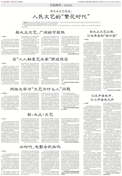 本期《文艺评论》,特邀不同领域的专家,从创作、传播、审美、价值、技术、产业及出海等多角度,进行一次新大众文艺笔谈。