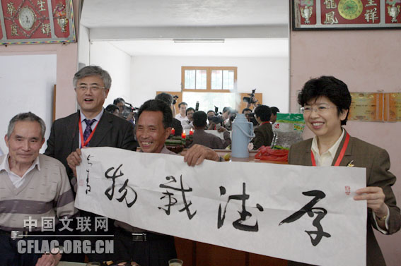 5月13日至14日,中国文联文艺家采风慰问井冈山革命老区行活动在革命圣地井冈山隆重举行。图为中国文联党组书记赵实一行为井冈山菖蒲古村老党员王子策、王海龙赠送书法作品。中国文联网 郭青剑 摄