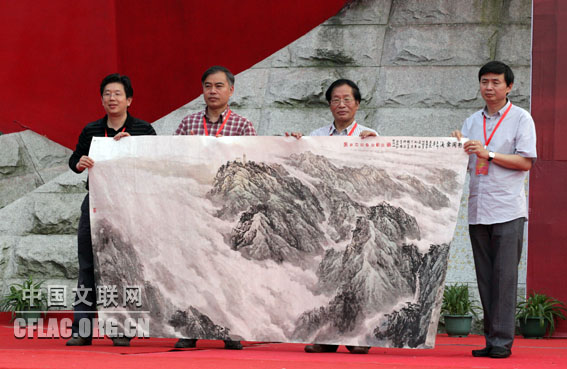 5月13日至14日,中国文联文艺家采风慰问井冈山革命老区行活动在革命圣地井冈山隆重举行。图为美术家展示作品。中国文联网 郭青剑 摄