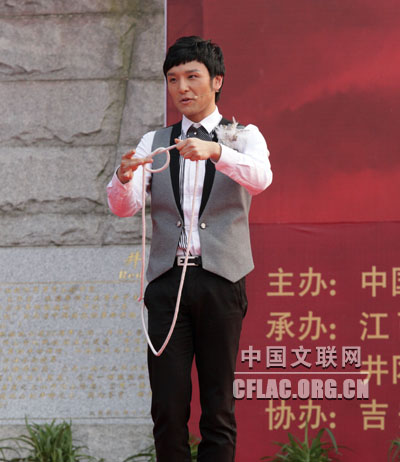 5月13日至14日,中国文联文艺家采风慰问井冈山革命老区行活动在革命圣地井冈山隆重举行。图为傅琰东表演魔术。中国文联网 郭青剑 摄