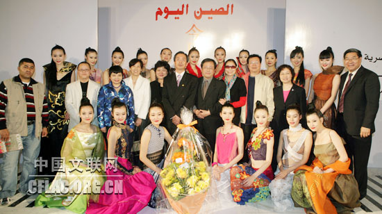 埃及当地时间2月5日,“今日中国”艺术周“中国风”时装展示在开罗歌剧院露天剧场成功举行。图为活动结束后,中国文联党组成员、副主席冯远,中国驻埃及大使武春华等与时装展示设计师、模特、工作人员合影。中国文联网 孟祥宁 摄
