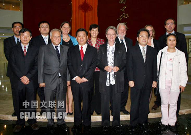 9月18日,中国文联党组书记、副主席胡振民在中国文艺家之家会见了前来中国访问的奥地利教育艺术文化部部长克劳迪娅·施密特一行,中国文联党组成员、副主席冯远以及中国文联国际联络部主任黄文娟,中国美协分党组书记、驻会副主席吴长江等陪同。图为胡振民等和克劳迪娅·施密特一行合影。中国文联网 余宁 摄