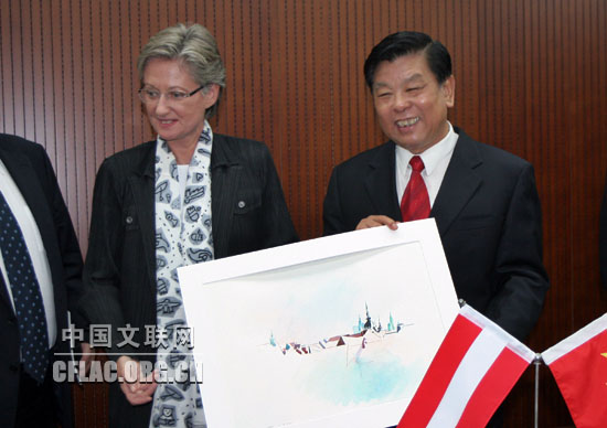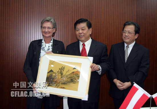 会谈结束时,中国文联向奥方赠送了冯远国画作品《野渡无人舟四横》等礼物;奥方回赠了奥地利著名水彩画家古特罗夫的新作。